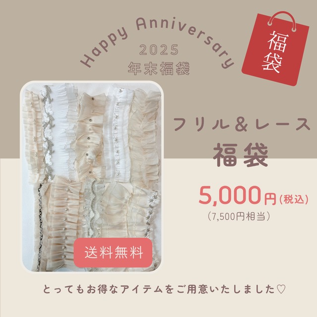 ::::::::::୨୧::::::::::୨୧::::::::::୨୧:::::::::: ♡ 年末限定 ♡ ★フリル&レース福袋【5,000円】★ ::::::::::୨୧::::::::::୨୧::::::::::୨୧:::::::::: 可愛さと上品さを詰め込んだ、 「フリル&レース素材」の年末限定スペシャル福袋♡ 人気の高いレースやフリルを贅沢に詰め合わせ、 約7,500円相当の豪華ボリュームでお届けします。 ハンドメイド作家さんにも、これから始める方にもおすすめ。 バッグやポーチ、アクセサリーなど、作品づくりの幅が広がるセットです♪ ::::::::::::::::::::::::::::::::::::::::::::::::::::::: ◆ 内容 ◆ フリル・レース生地・トリムなど 50cm × 10本(合計5m) 【ポイント】 ・上品なレースや華やかなフリル素材をランダムにセレクト。 ・繊細なデザインから存在感のあるフリルまで、幅広い種類をお楽しみいただけます。 ・重ね使いやアレンジにもぴったり。小物や衣装、布小物制作にも◎ ・10種類すべて異なるフリル&レースが入るので、開けて楽しいサプライズ感たっぷり♪ ::::::::::::::::::::::::::::::::::::::::::::::::::::::: ◆ 福袋特別企画 ◆ 1回のご注文につき、15,000円ごとに 《3,000円福袋》を1つプレゼント! 【例】 ・15,000円 → 福袋×1つプレゼント ・30,000円 → 福袋×2つプレゼント ※色やデザインはおまかせとなります。 ※クーポン・割引後の金額が対象です。 ※他の福袋・通常商品を同時購入された場合も対象です。 ::::::::::::::::::::::::::::::::::::::::::::::::::::::: ◆ ご注意事項 ◆ ・デザイン・カラーはランダムです(同デザインの色違いが入る場合もございます)。 ・お客様都合による返品・交換はお受けできません。 ・掲載写真は一例です。実際の商品とは異なる場合があります。 ◆ お届けについて ◆ こちらは予約販売商品です。 発送予定:12月20日〜31日頃 ※他の商品と同時購入された場合、すべて揃い次第の発送となります。 ::::::::::::::::::::::::::::::::::::::::::::::::::::::: ★ 年に一度の特別企画 ★ 繊細で可愛いフリルやレースで、作品づくりをもっと華やかに♡ 開けた瞬間のときめきを、ぜひお楽しみください。 :::::::::::::::::::::::::::::::::::::::::::::::::::::::