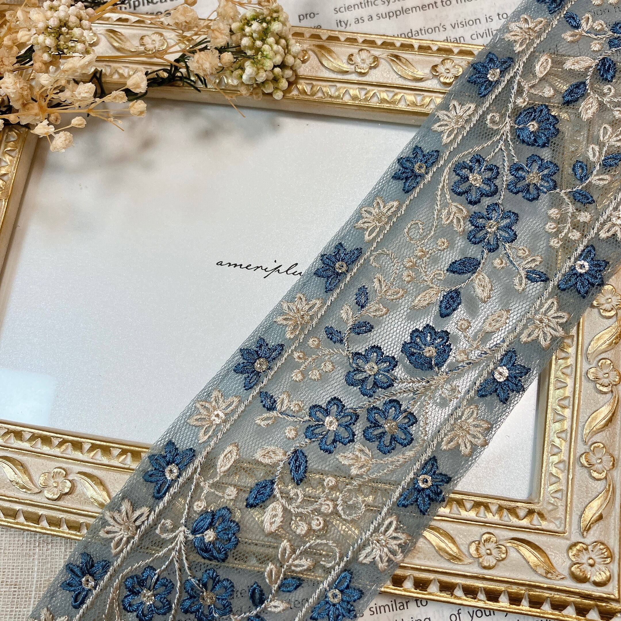 フローラ・レーヴ [インディゴグレー]インド刺繍リボン A_0094