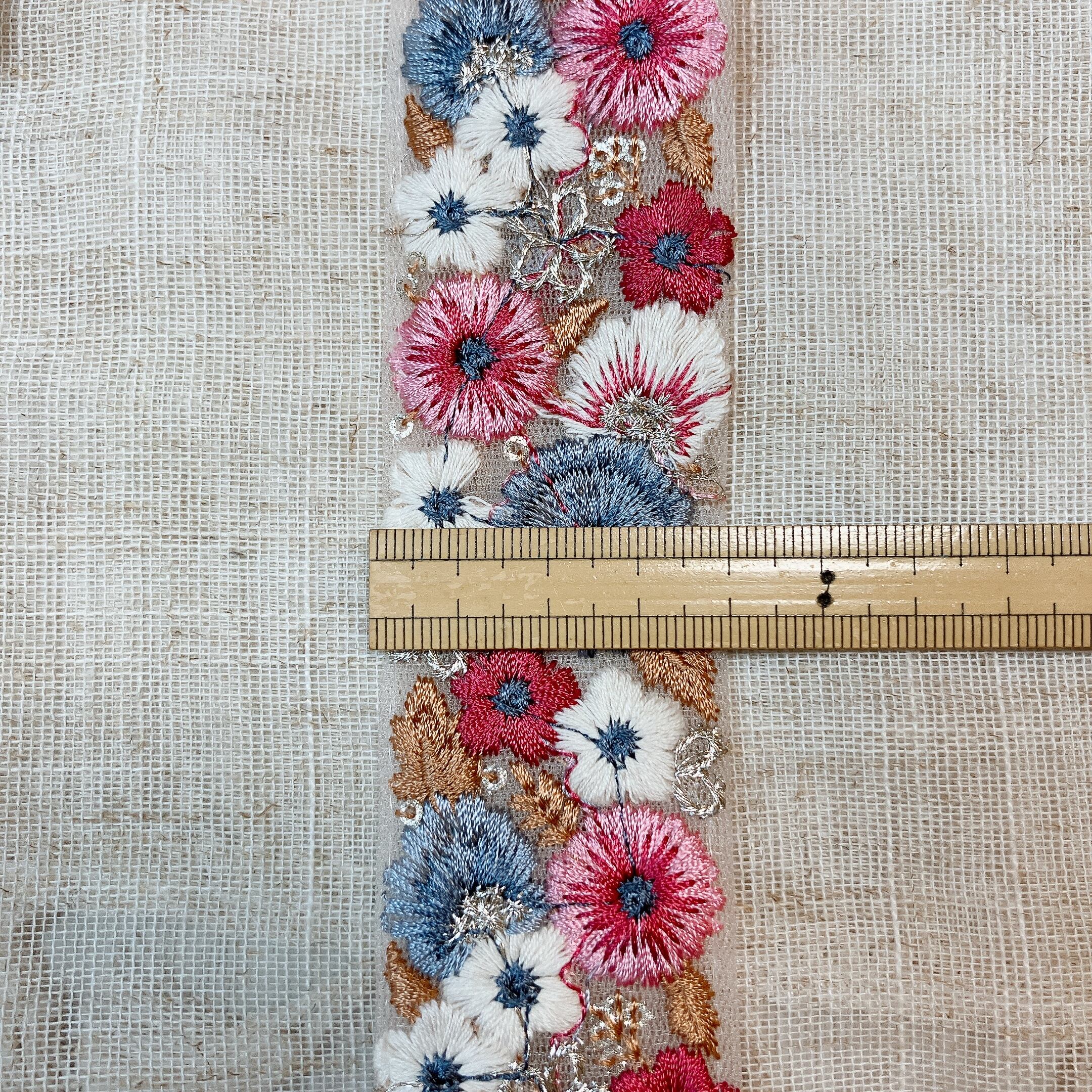 ポンポンフルール [ピンクブルー]インド刺繍リボン A_0103
