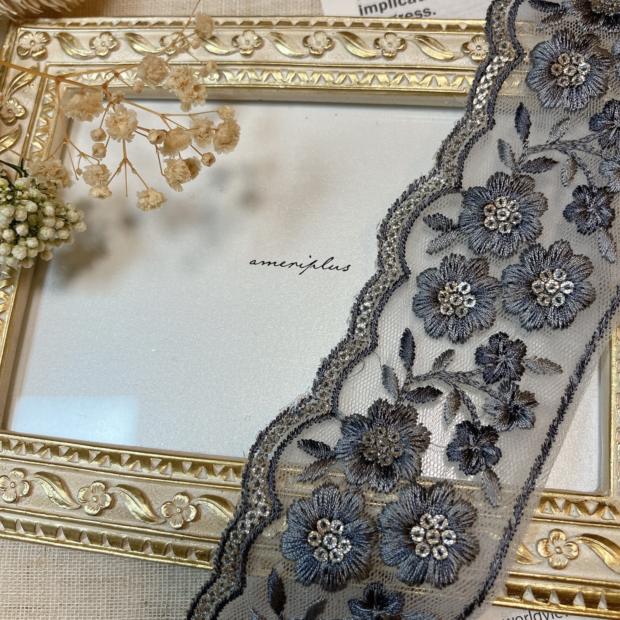 フローレット・レースリボン [スモーキーブルー]インド刺繍リボン A_0146