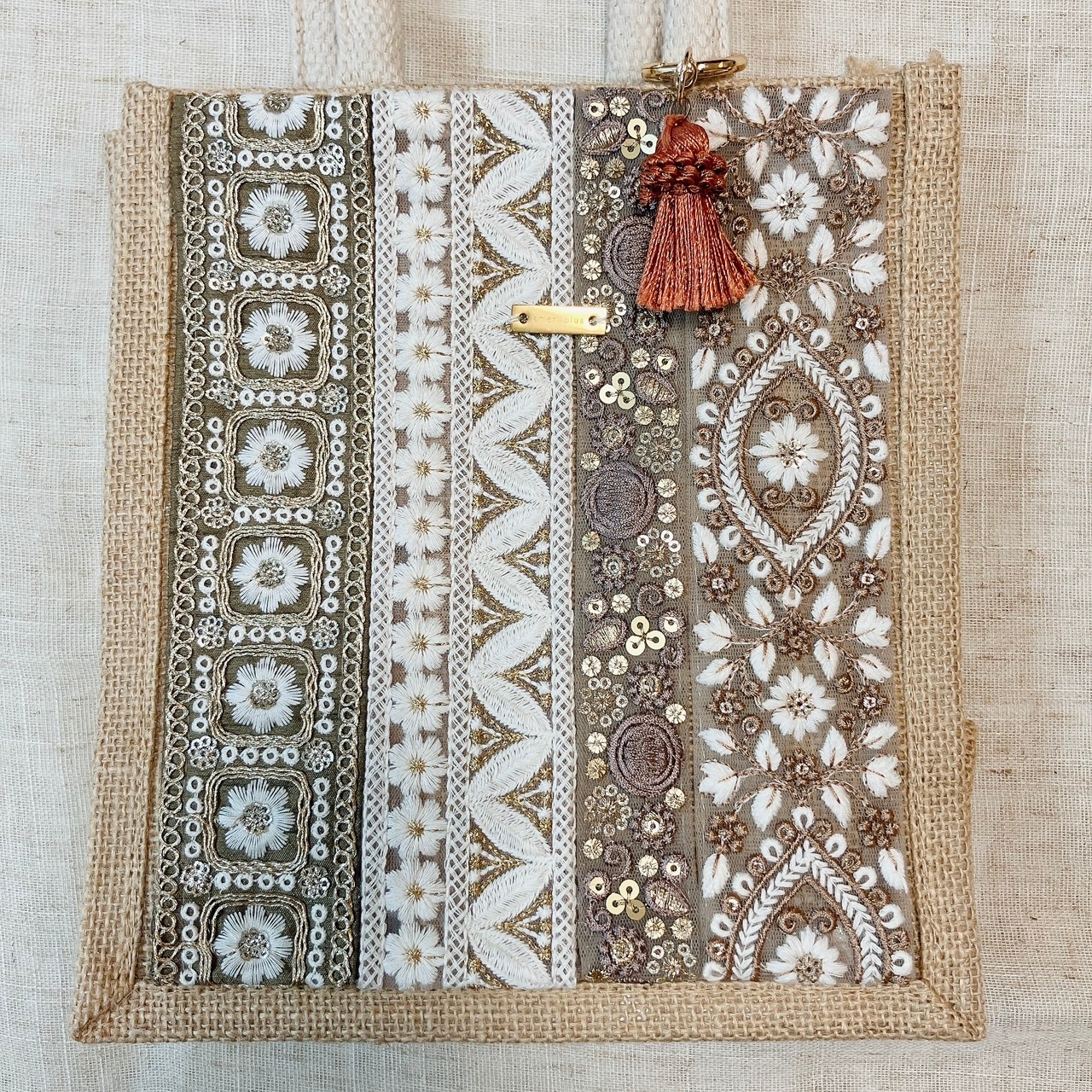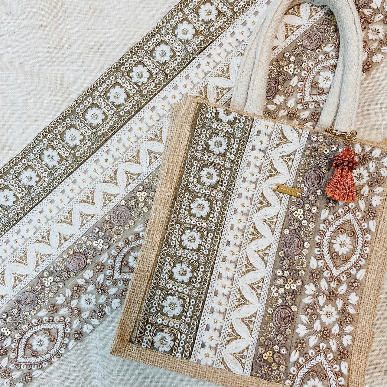 無印のA6サイズのジュートバッグアレンジが2個分作れる、インド刺繍リボンの4種セットです。