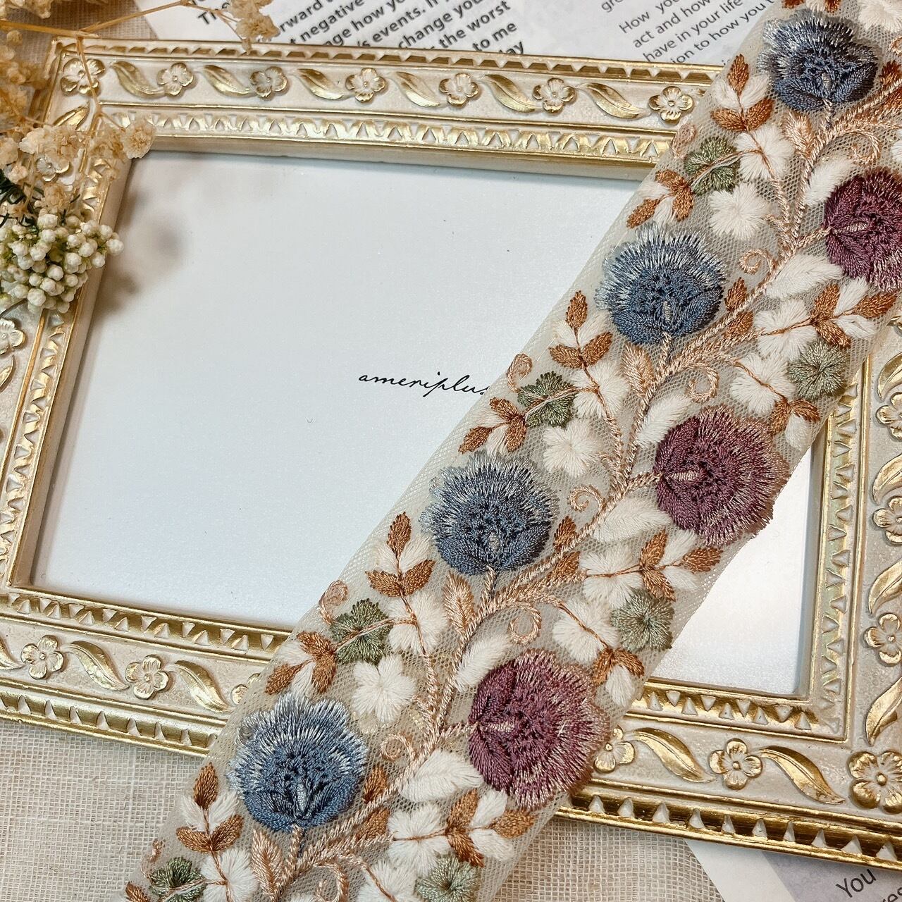 ロゼブロッサムレース [ブルーベージュ]インド刺繍リボン A_0299