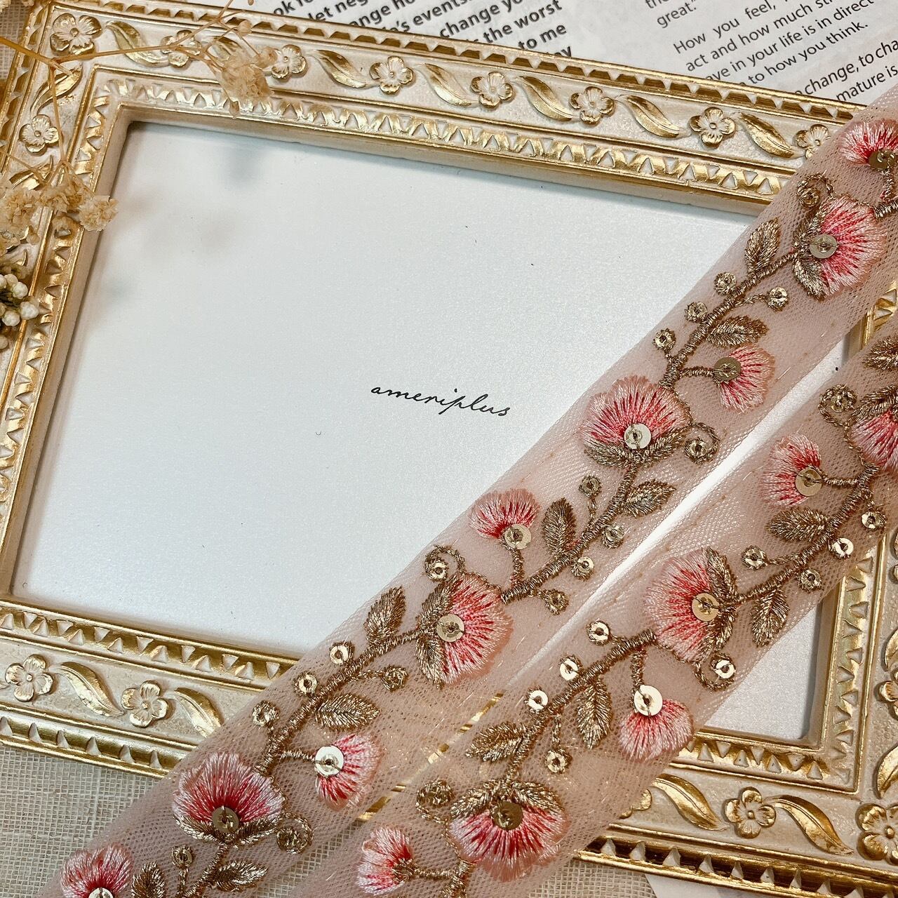 シャルロットレース [ローズピンク]インド刺繍リボン A_0305