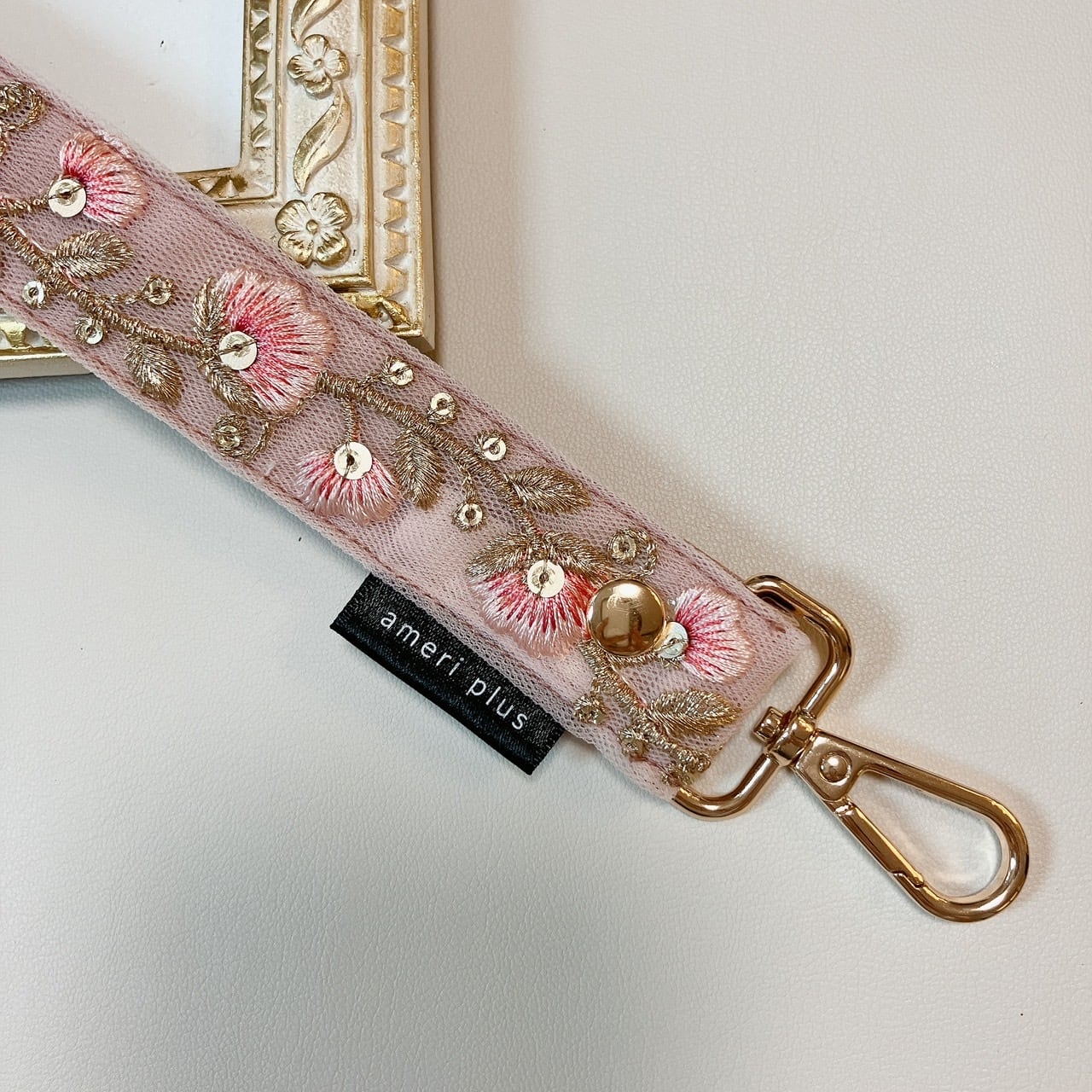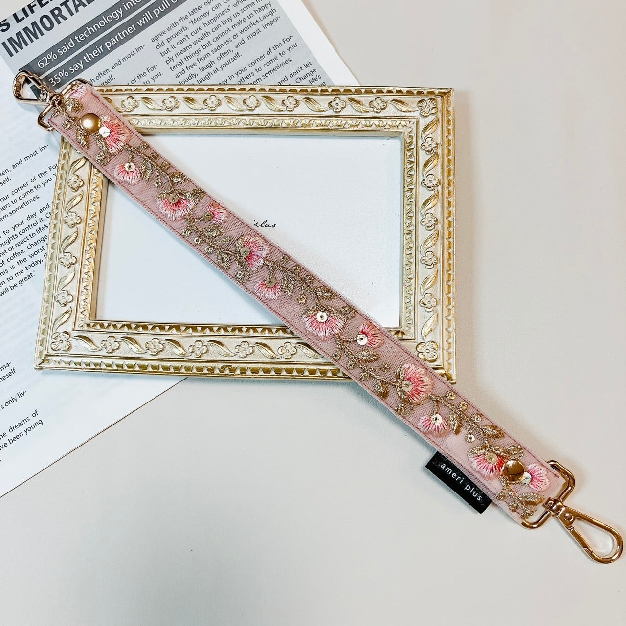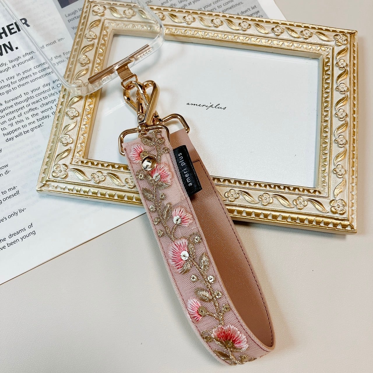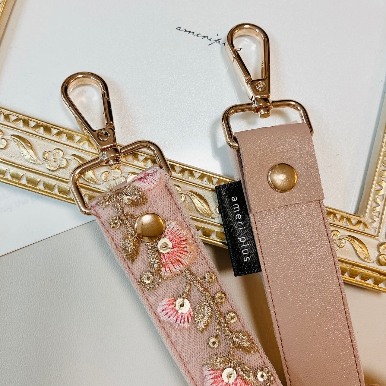 【再販】manywayハンドストラップ《インド刺繍×フェイクレザー》くすみピンク