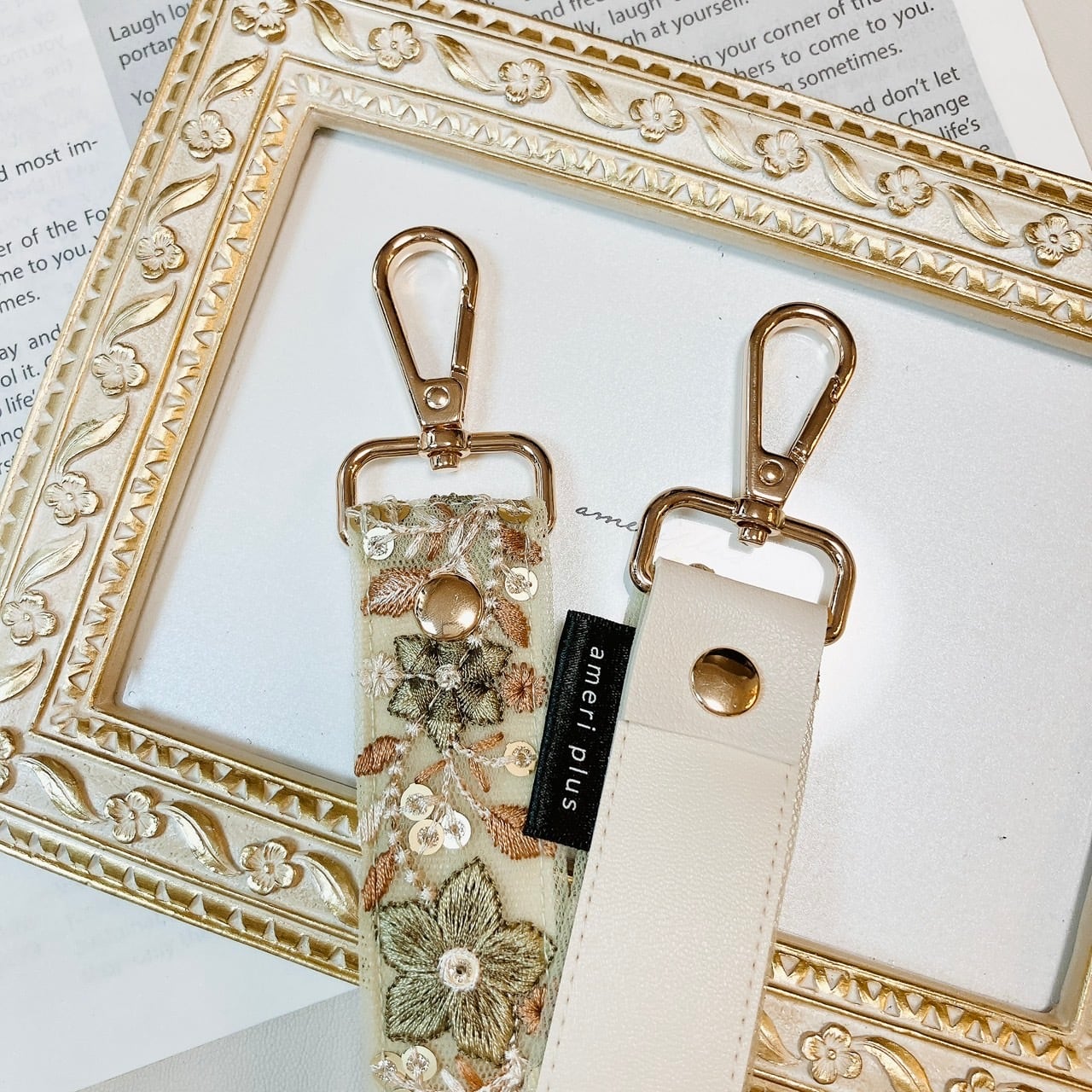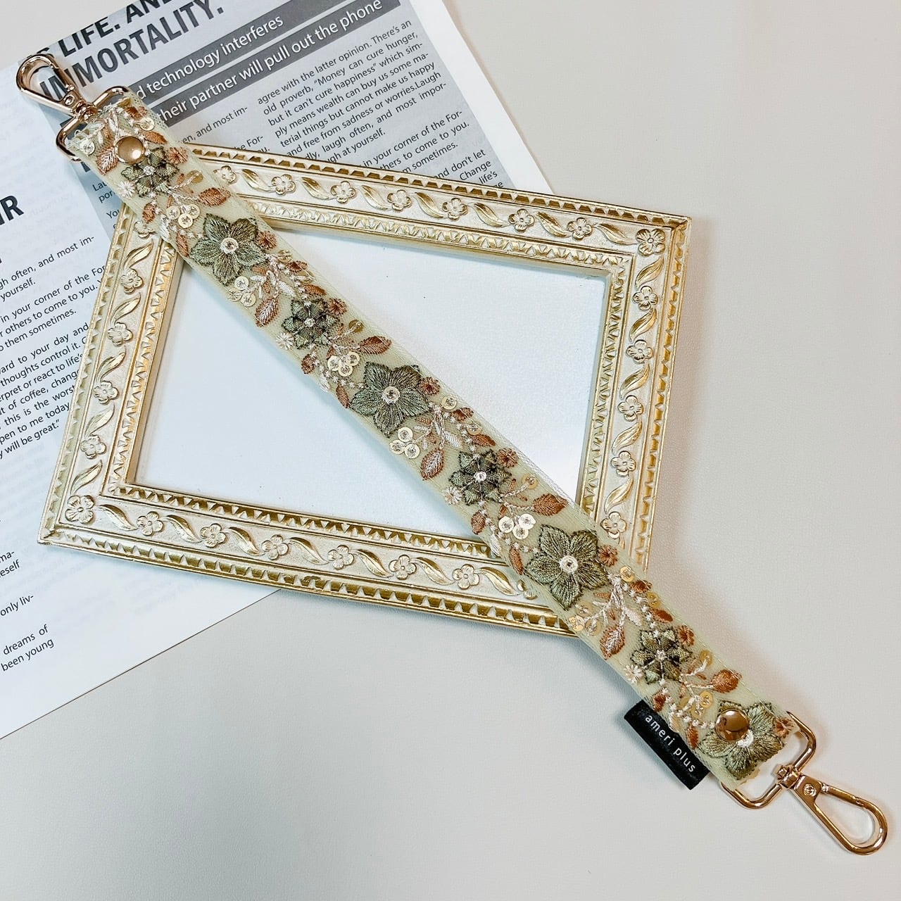 繊細で美しいインド刺繍リボンを贅沢に使用し、裏地には高級感のあるフェイクレザーを合わせた、上品でおしゃれなハンドストラップが完成しました。