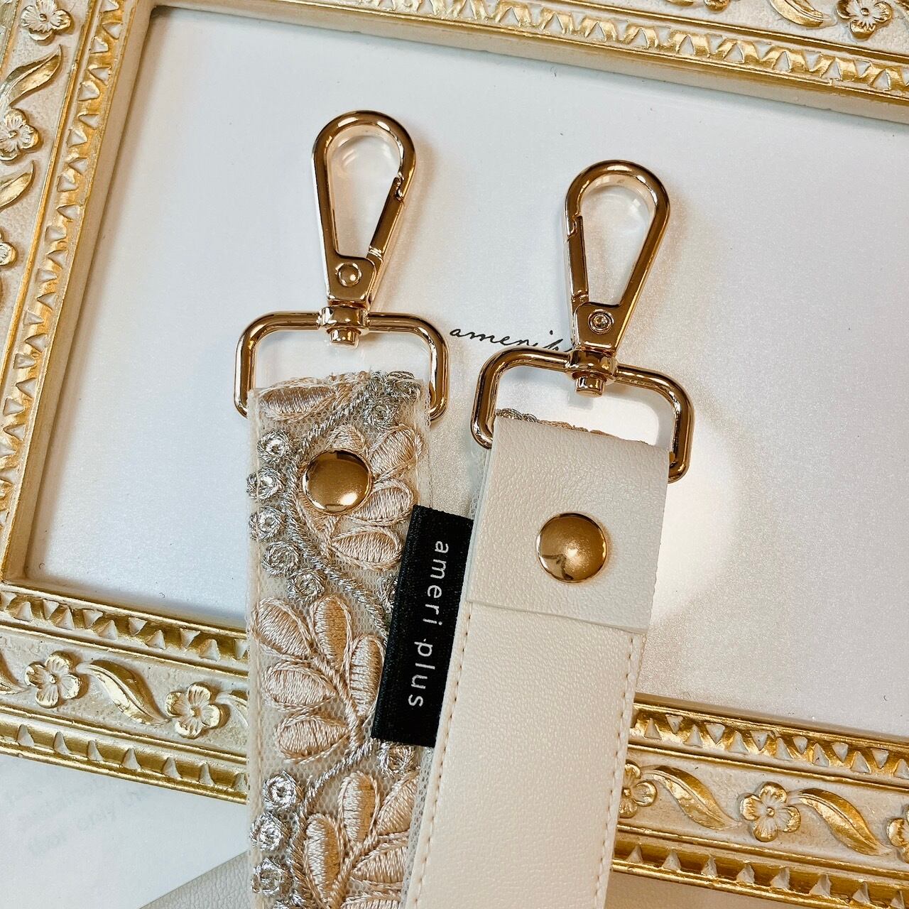 繊細で美しいインド刺繍リボンを贅沢に使用し、裏地には高級感のあるフェイクレザーを合わせた、上品でおしゃれなハンドストラップが完成しました。