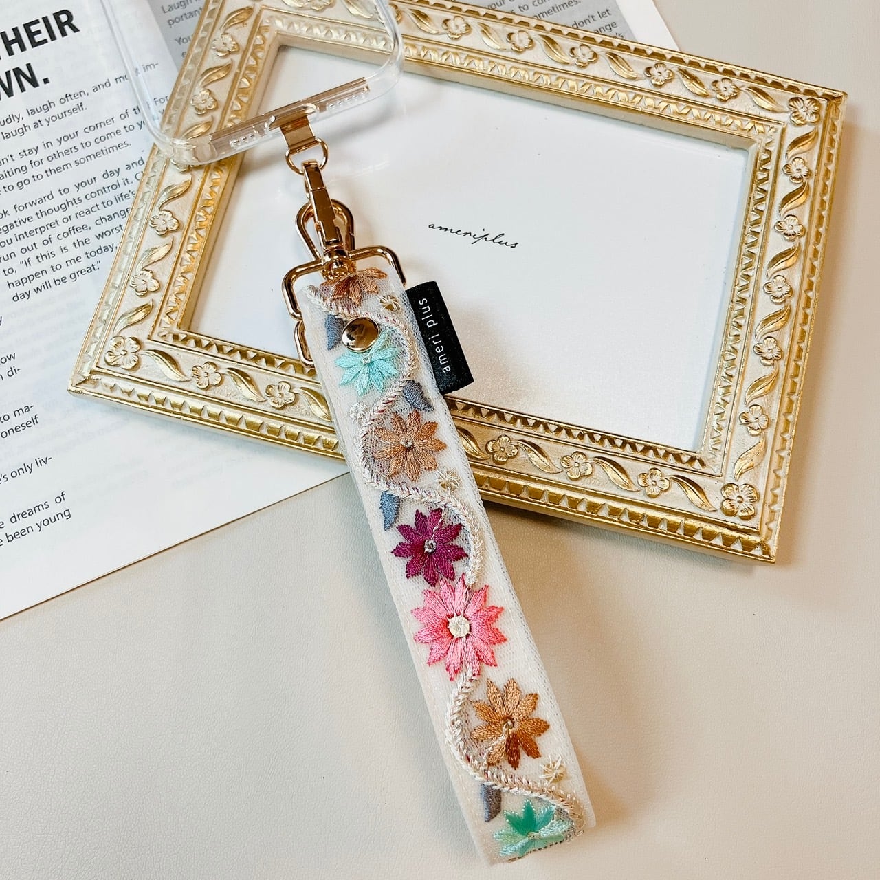 繊細で美しいインド刺繍リボンを贅沢に使用し、裏地には高級感のあるフェイクレザーを合わせた、上品でおしゃれなハンドストラップが完成しました。