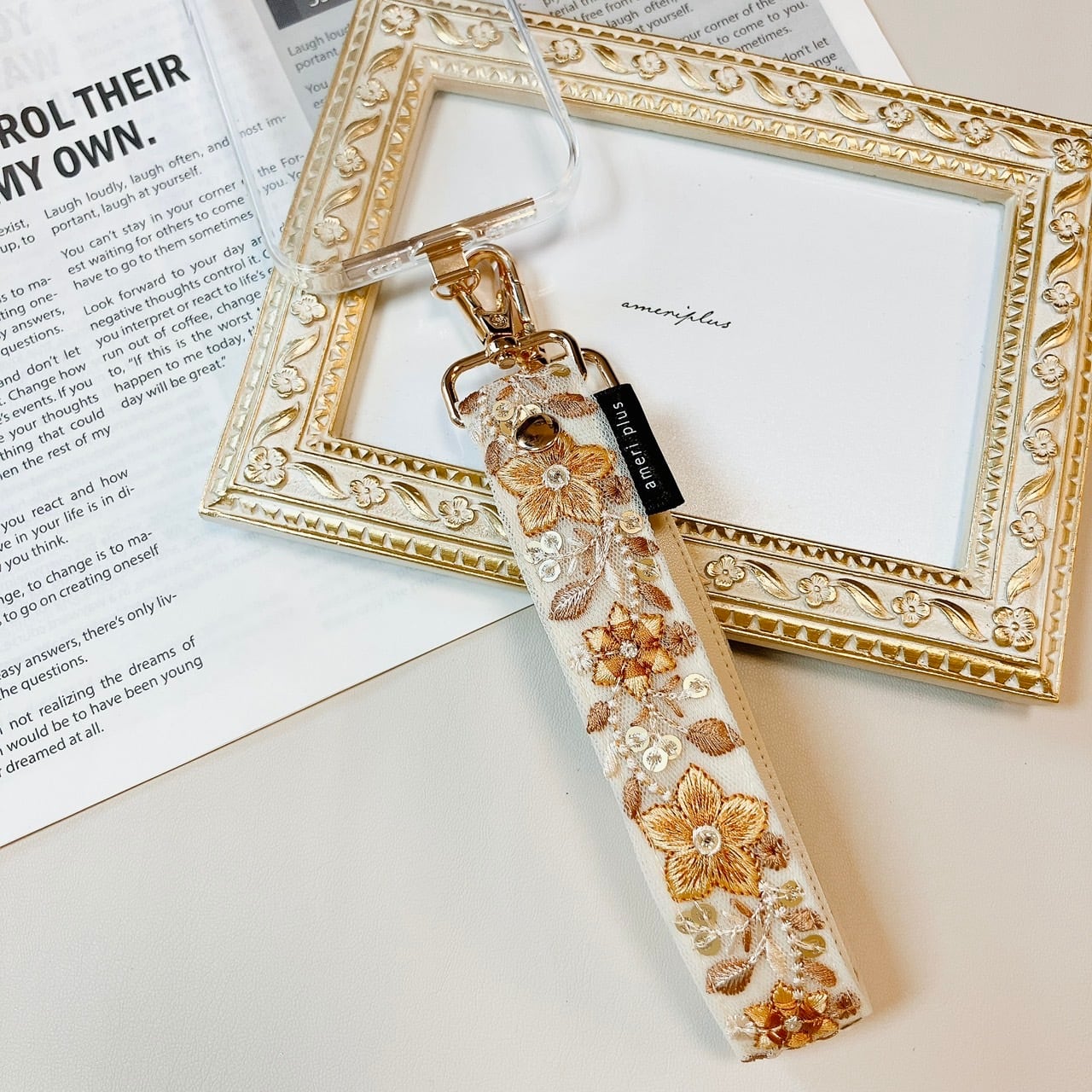 繊細で美しいインド刺繍リボンを贅沢に使用し、裏地には高級感のあるフェイクレザーを合わせた、上品でおしゃれなハンドストラップが完成しました。