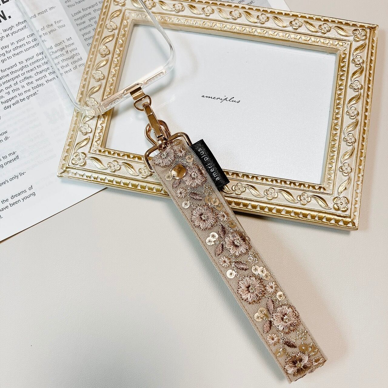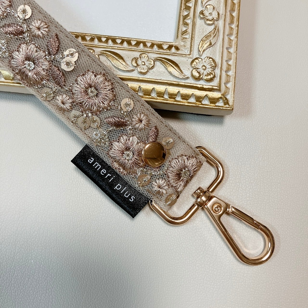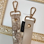繊細で美しいインド刺繍リボンを贅沢に使用し、裏地には高級感のあるフェイクレザーを合わせた、上品でおしゃれなハンドストラップが完成しました。