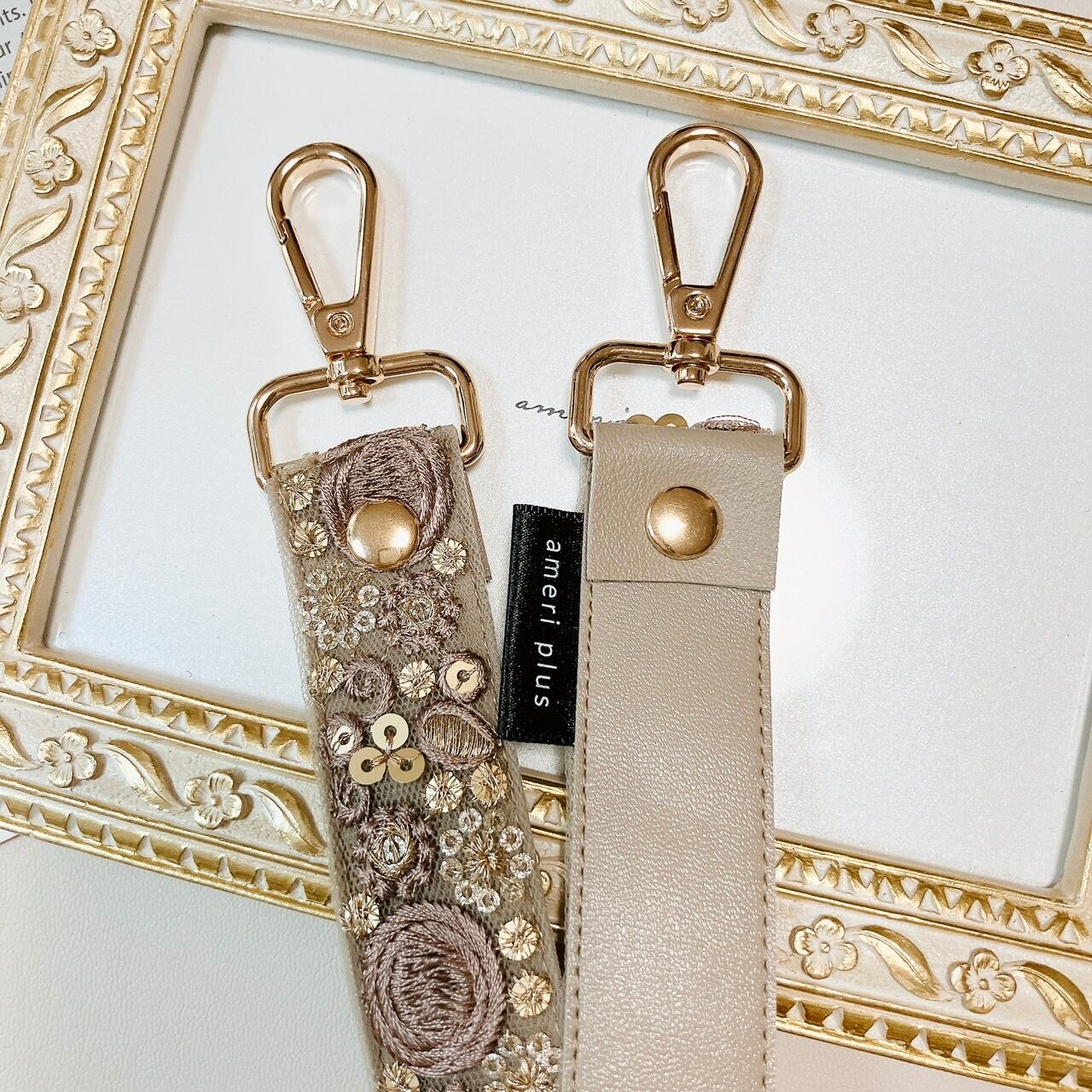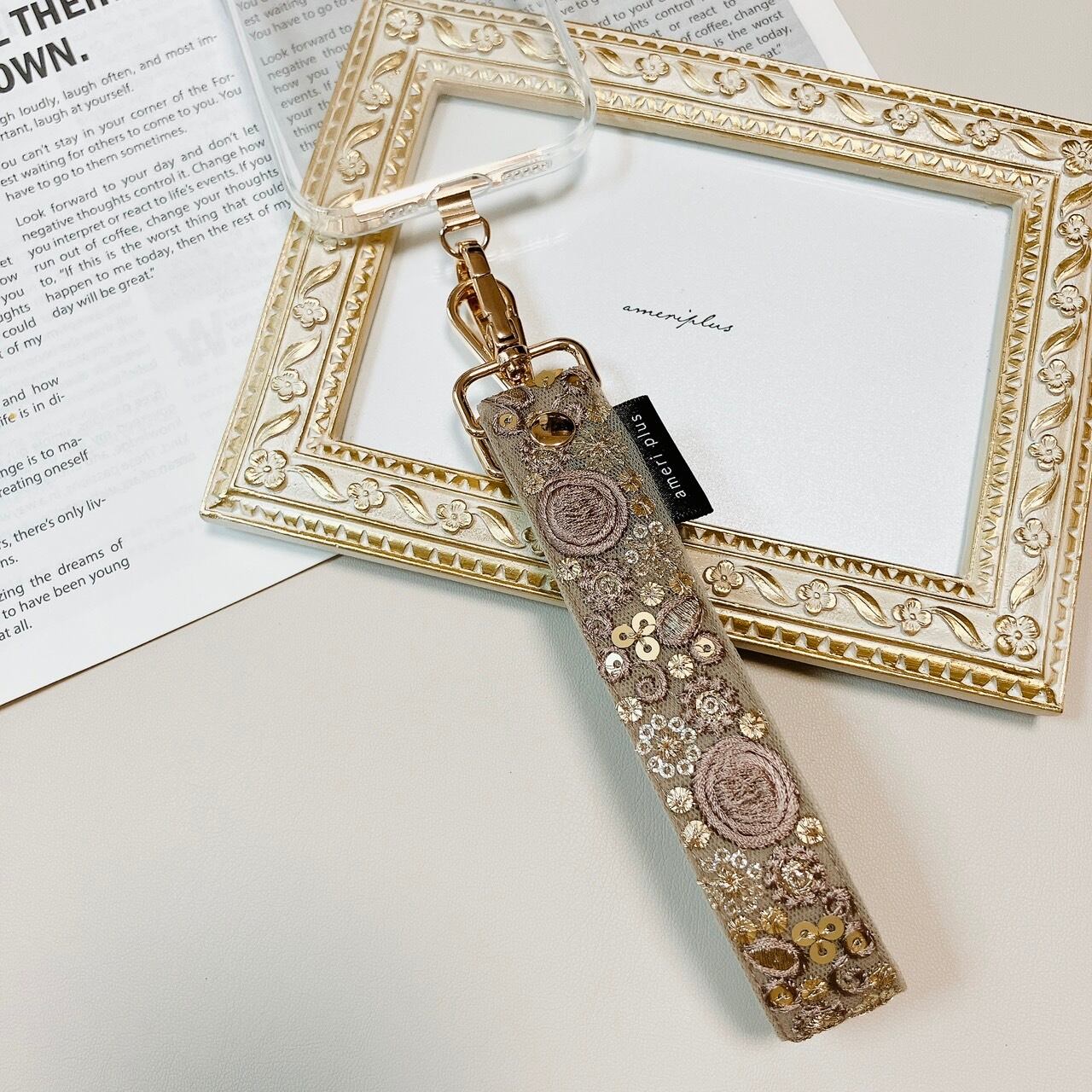 繊細で美しいインド刺繍リボンを贅沢に使用し、裏地には高級感のあるフェイクレザーを合わせた、上品でおしゃれなハンドストラップが完成しました。