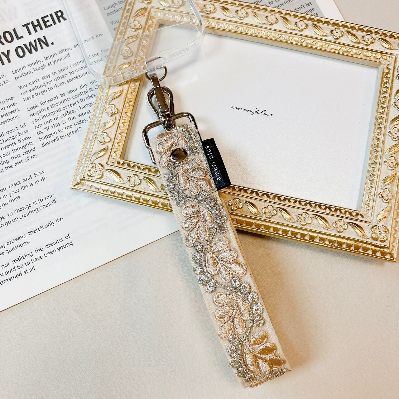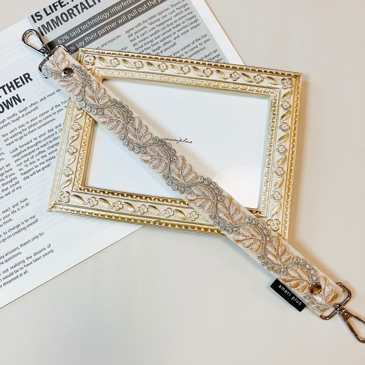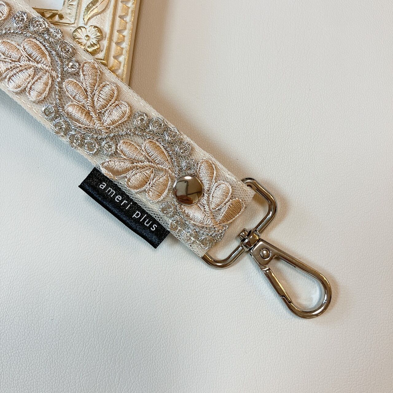 【再販】manywayハンドストラップ《インド刺繍×フェイクレザー》シャンパンピンク