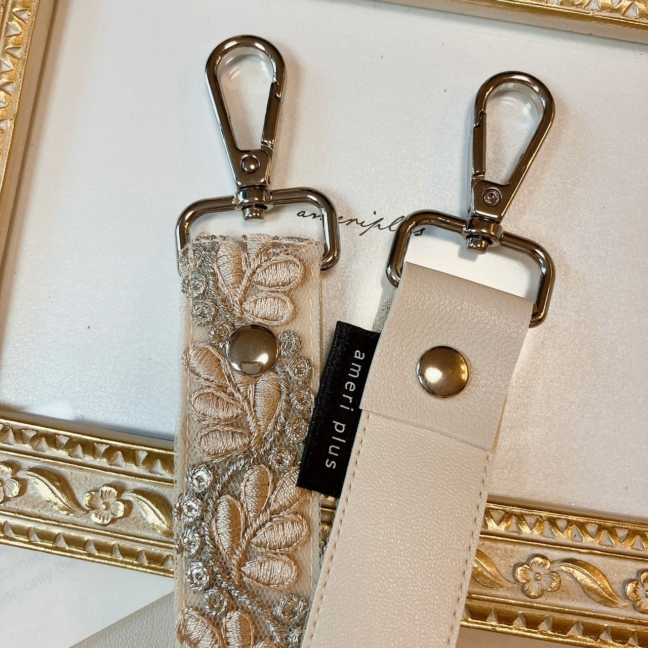 繊細で美しいインド刺繍リボンを贅沢に使用し、裏地には高級感のあるフェイクレザーを合わせた、上品でおしゃれなハンドストラップが完成しました。