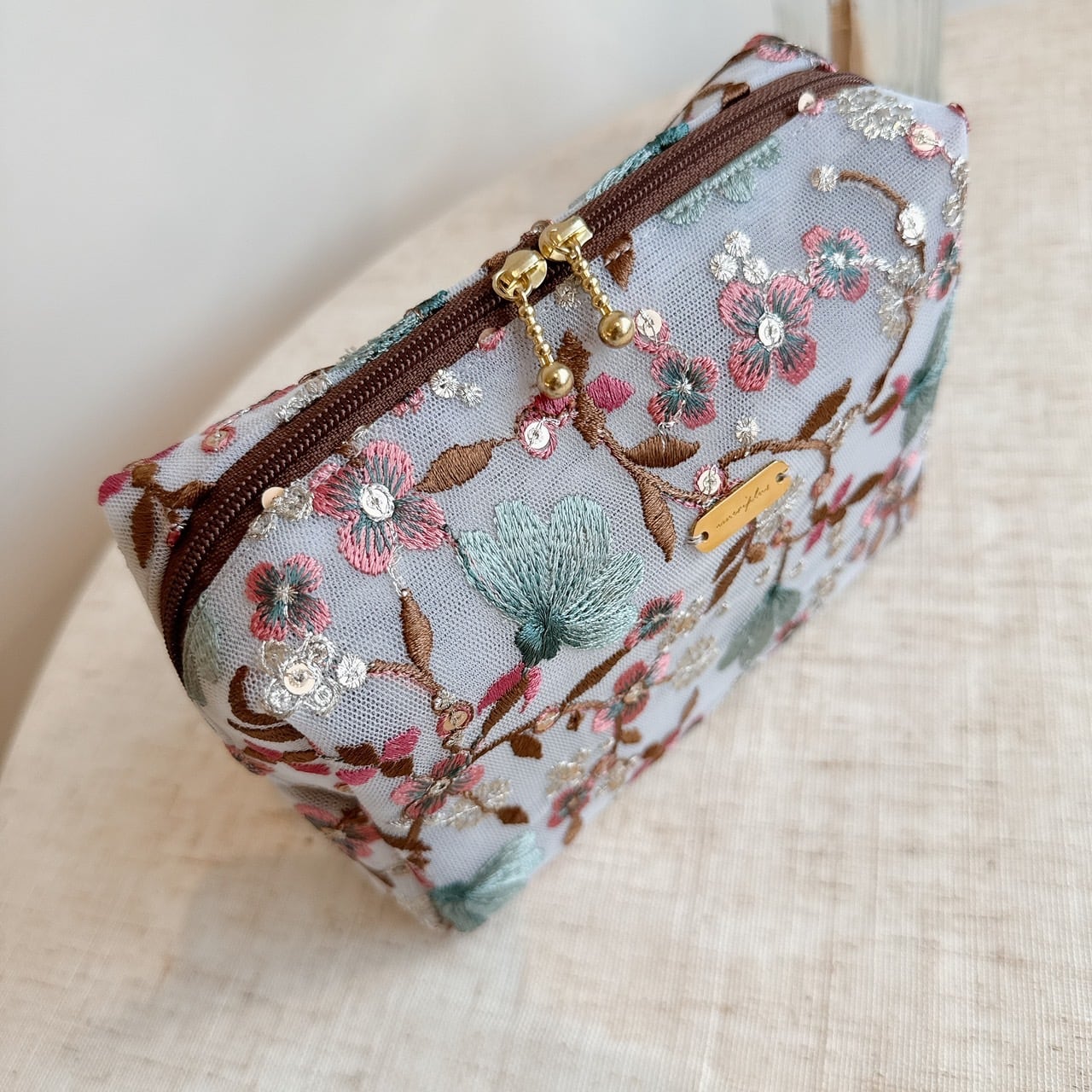 ふっくらとしたフォルムと、繊細なインド刺繍生地を贅沢に使った「フローラルエレガンスポーチ」。