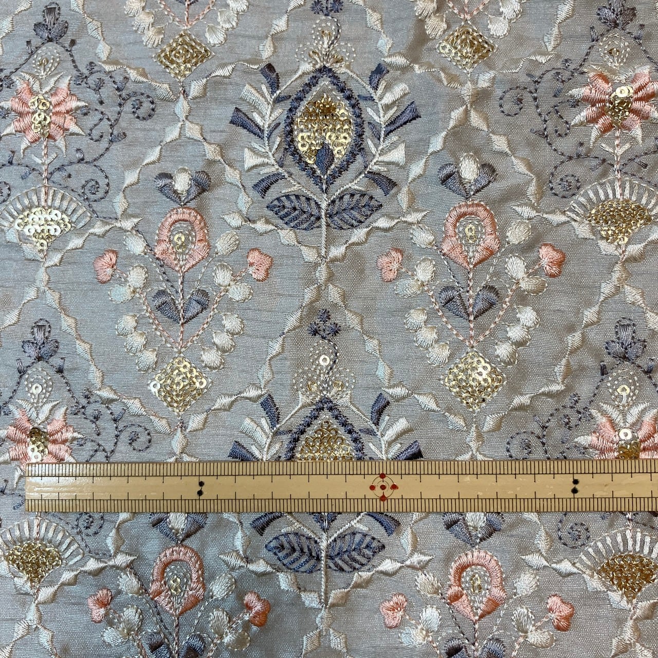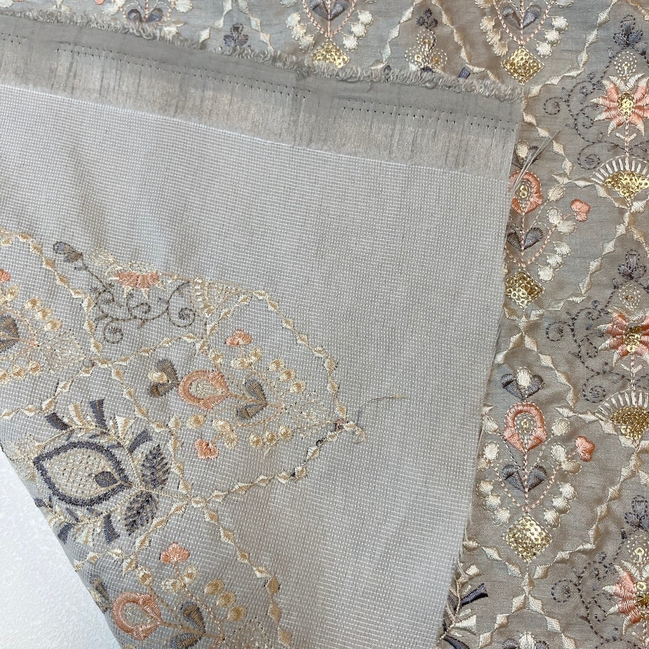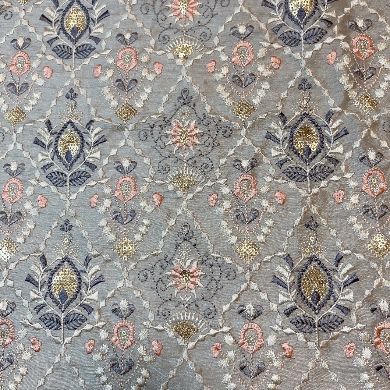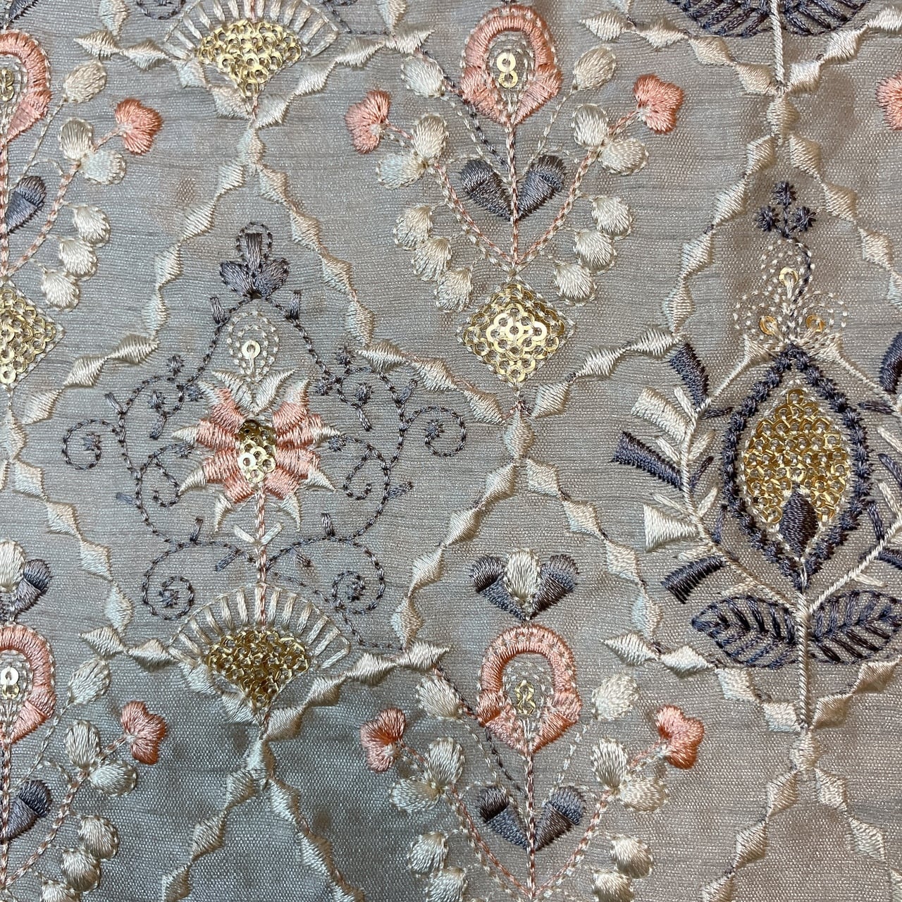 ロイヤルブロカーディア [グレージュブルーム]インド刺繍生地 D_0014