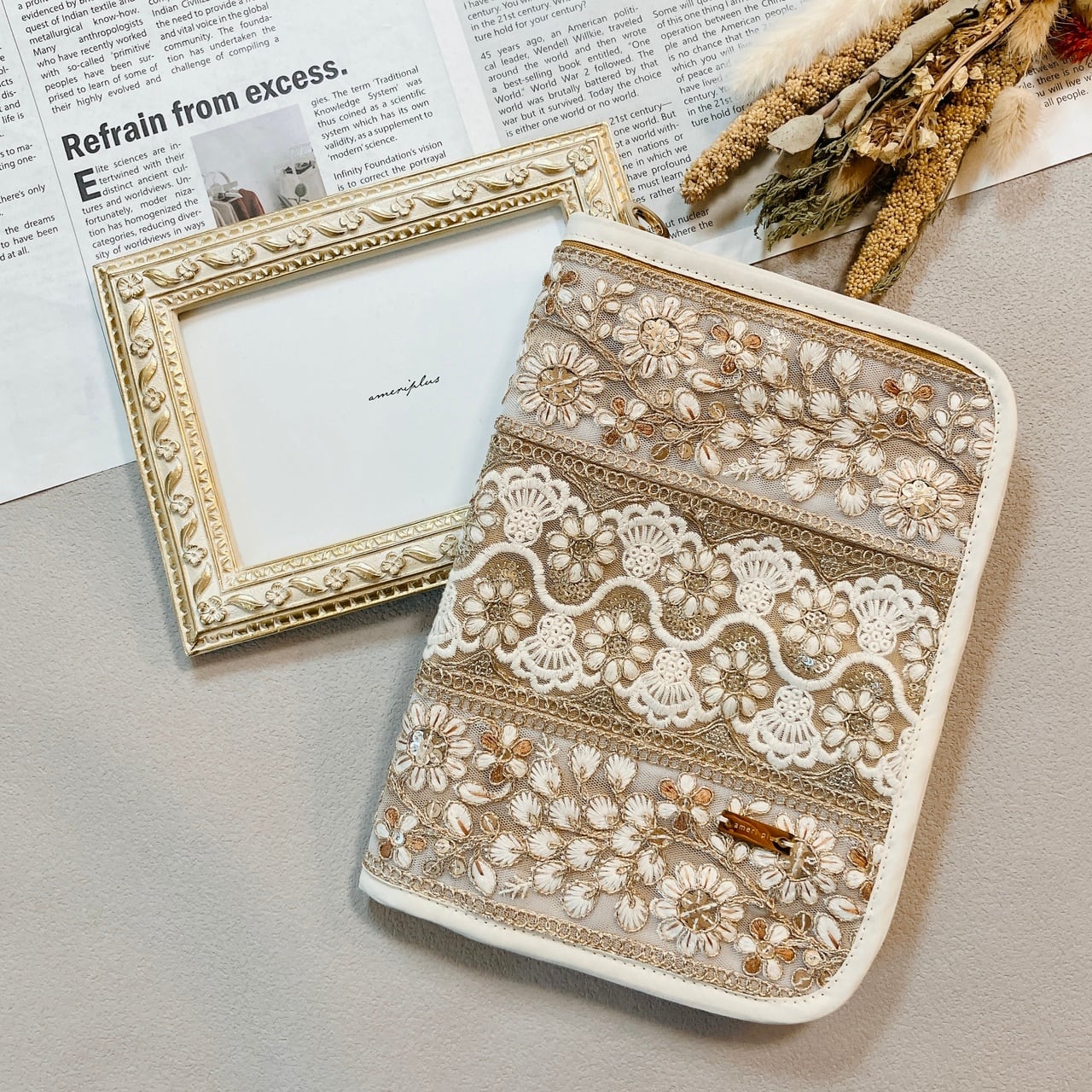 ふっくらとしたフォルムと上質なインド刺繍リボンを使い、使うたびに気分が上がるデザインに仕立てています。