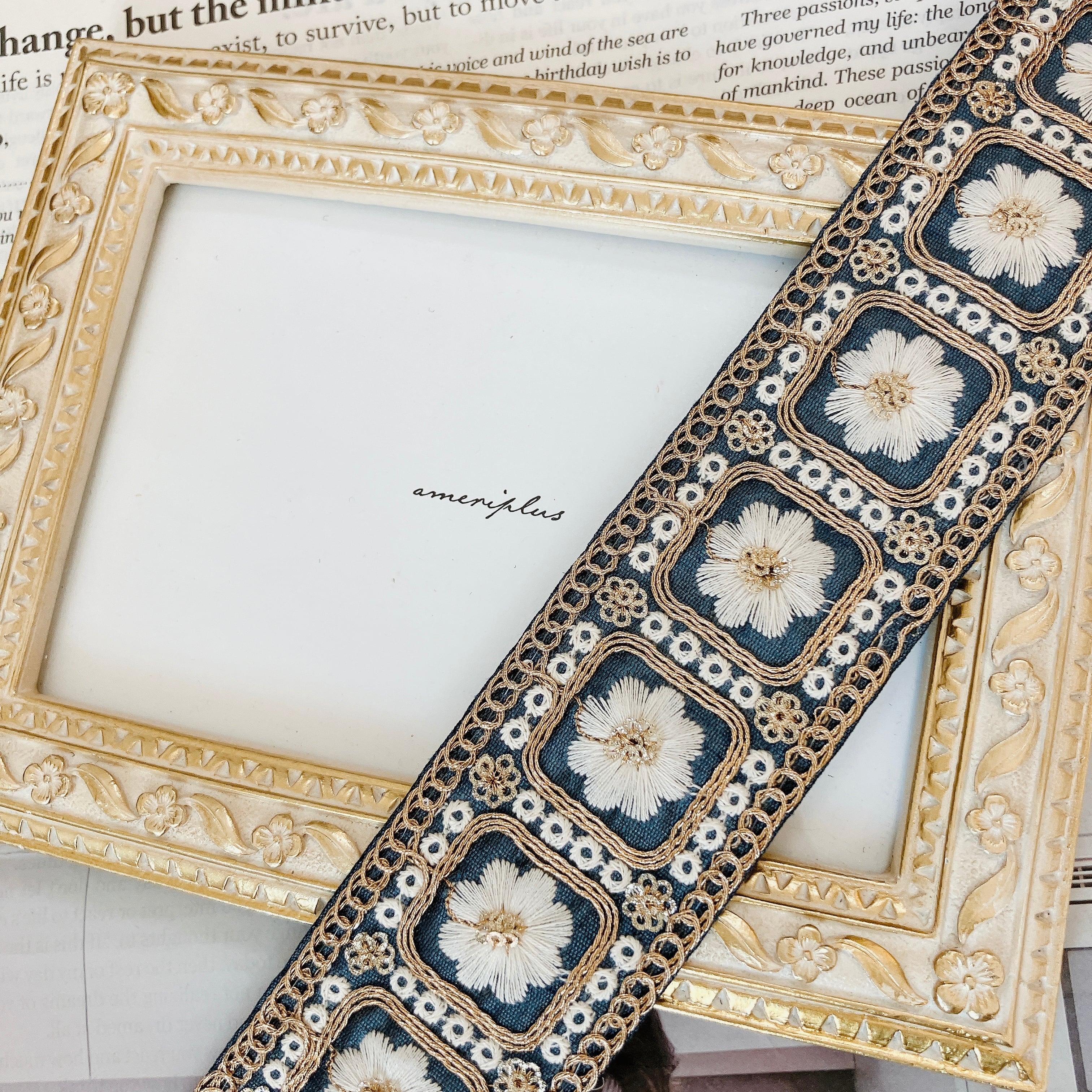 フローラル・ブロック [ディープネイビー]インド刺繍リボン A_0595