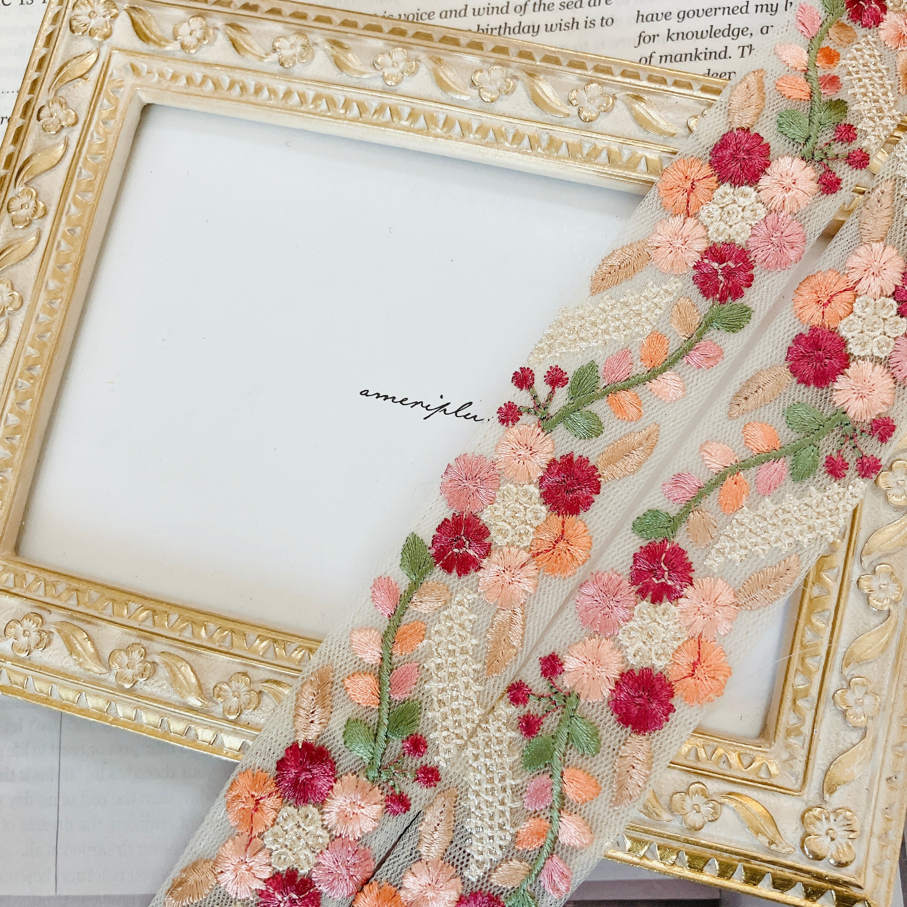 インドから直輸入した、カラフルで繊細なミシン刺繍が魅力のリボンです。