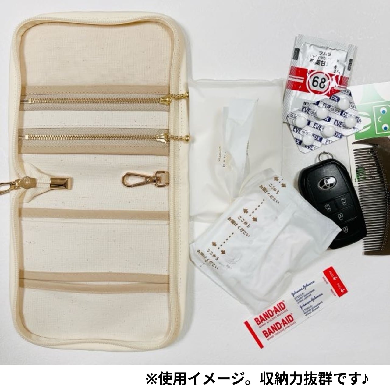 お薬・ばんそうこう・鍵・カード・小物・サニタリー用品など、毎日持ち歩きたいアイテムをひとつにまとめて収納できる便利なマルチポーチ(安心ポーチ) が完成しました♡