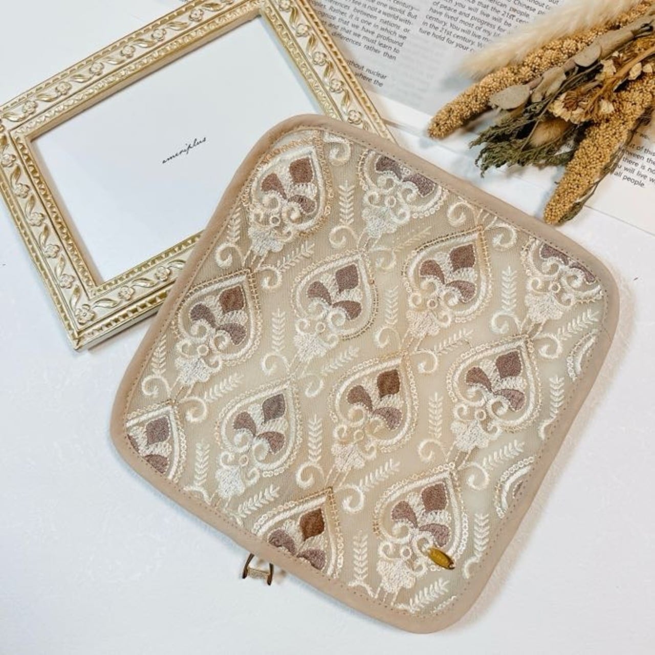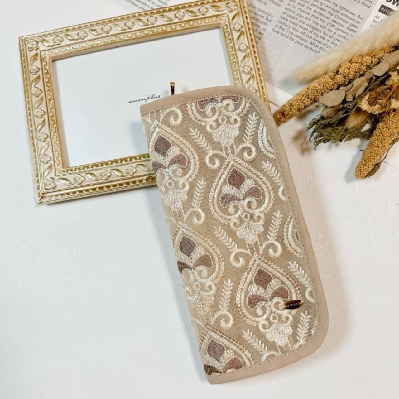 華やかな インド刺繍リボンと軽やかな ハードメッシュ素材 を組み合わせた大人可愛いスリムポーチです。